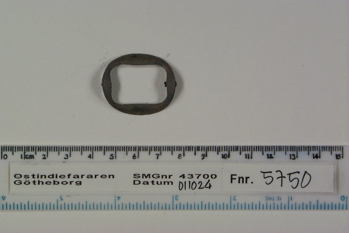 Ovalt spänne, förtjockningar med hål för mittstolpe på kortsidorna, rester av mittstolpe i hålen.