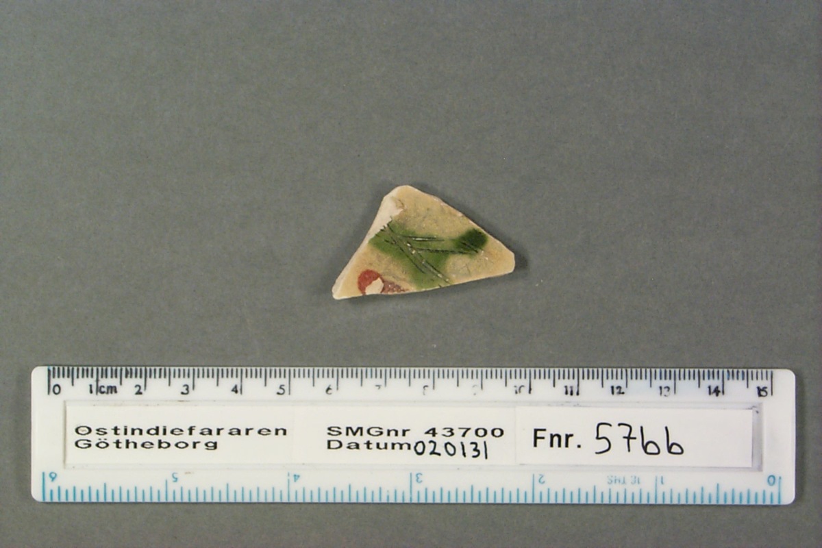 Skärva, flat, ljust gods med ristat mönster, färgat i grönt, rött och gult. Glaserad.