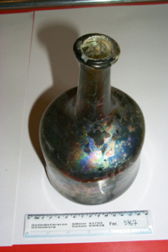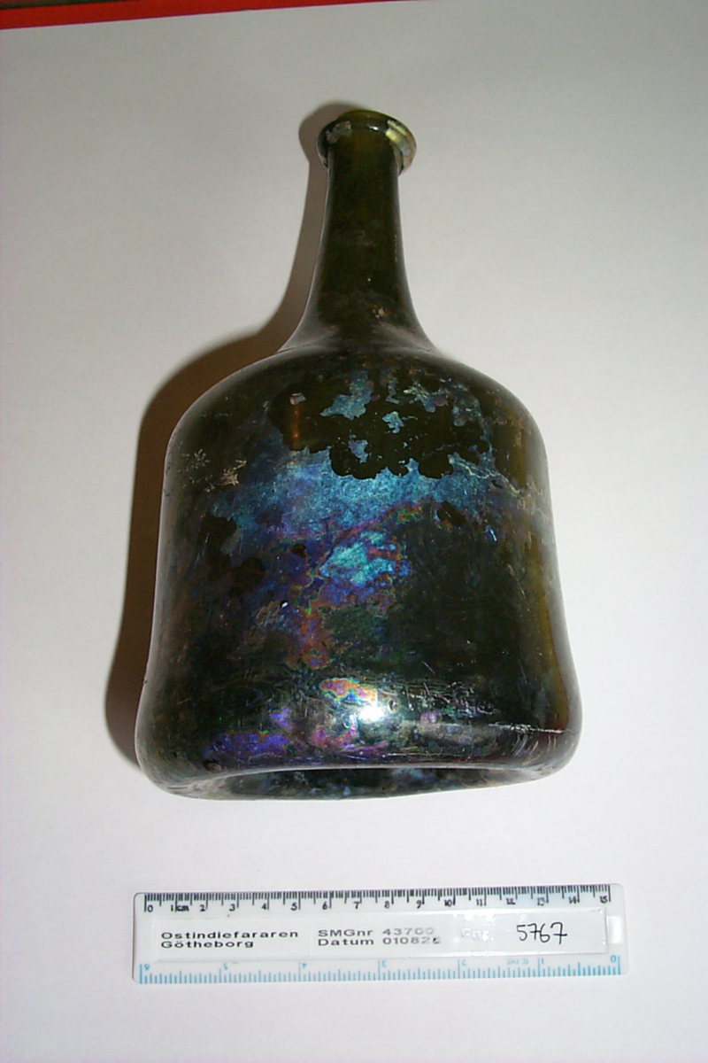 Hel glasflaska, grönt glas, iriserande yta, flammig i många färger. Smal hals med mynning d: 23 mm.