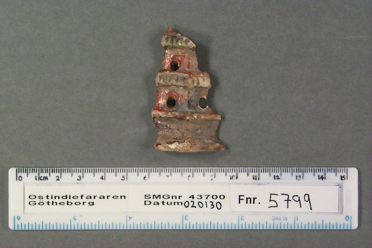 Föremålet är från vraket av ostindiefararen Götheborg, som gjorde tre resor till Kina 1739-45. Vid hemkomsten från den sista resan 12 september 1745 förliste fartyget vid grundet Hunnebådan strax utanför Nya Elfsborgs fästning. Vid flera tillfällen har material tagits upp från vraket. Föremålet kommer från de marinarkeologiska utgrävningarna på platsen 1986-1992.