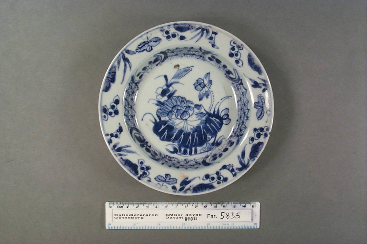 Kategori A; Underglasyrblå dekor; motiv: lotusblommor i mitten, vindruvor och blad på brättet.