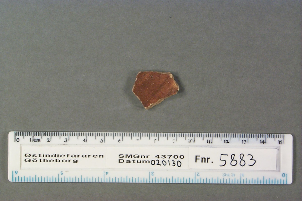 Föremålet är från vraket av ostindiefararen Götheborg, som gjorde tre resor till Kina 1739-45. Vid hemkomsten från den sista resan 12 september 1745 förliste fartyget vid grundet Hunnebådan strax utanför Nya Elfsborgs fästning. Vid flera tillfällen har material tagits upp från vraket. Föremålet kommer från de marinarkeologiska utgrävningarna på platsen 1986-1992.