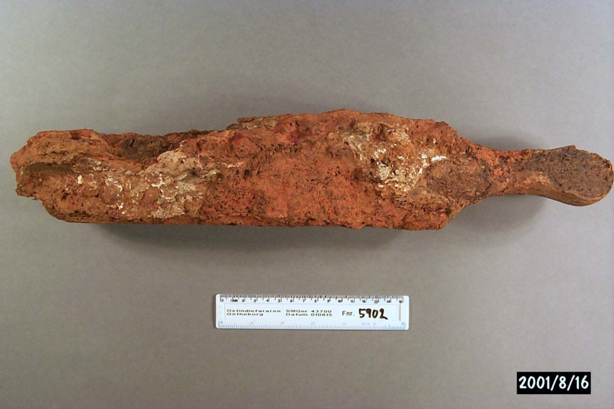 Föremålet är från vraket av ostindiefararen Götheborg, som gjorde tre resor till Kina 1739-45. Vid hemkomsten från den sista resan 12 september 1745 förliste fartyget vid grundet Hunnebådan strax utanför Nya Elfsborgs fästning. Vid flera tillfällen har material tagits upp från vraket. Föremålet kommer från de marinarkeologiska utgrävningarna på platsen 1986-1992.