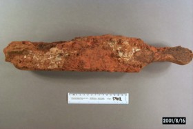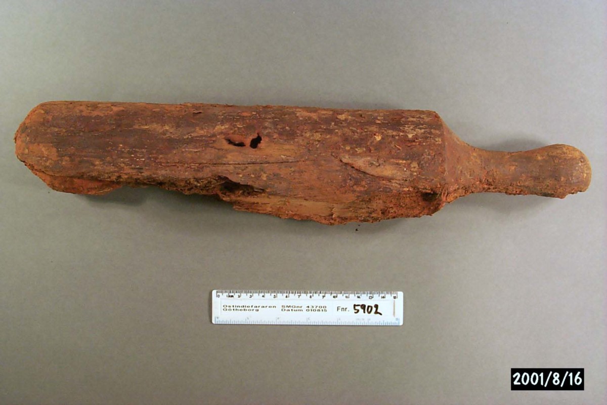 Svarvat trästycke, cirkulärt snitt. Handtag i ena änden. Avbruten. Kraftig korrosionsbeläggning/krusta. Angripet av skeppsmask