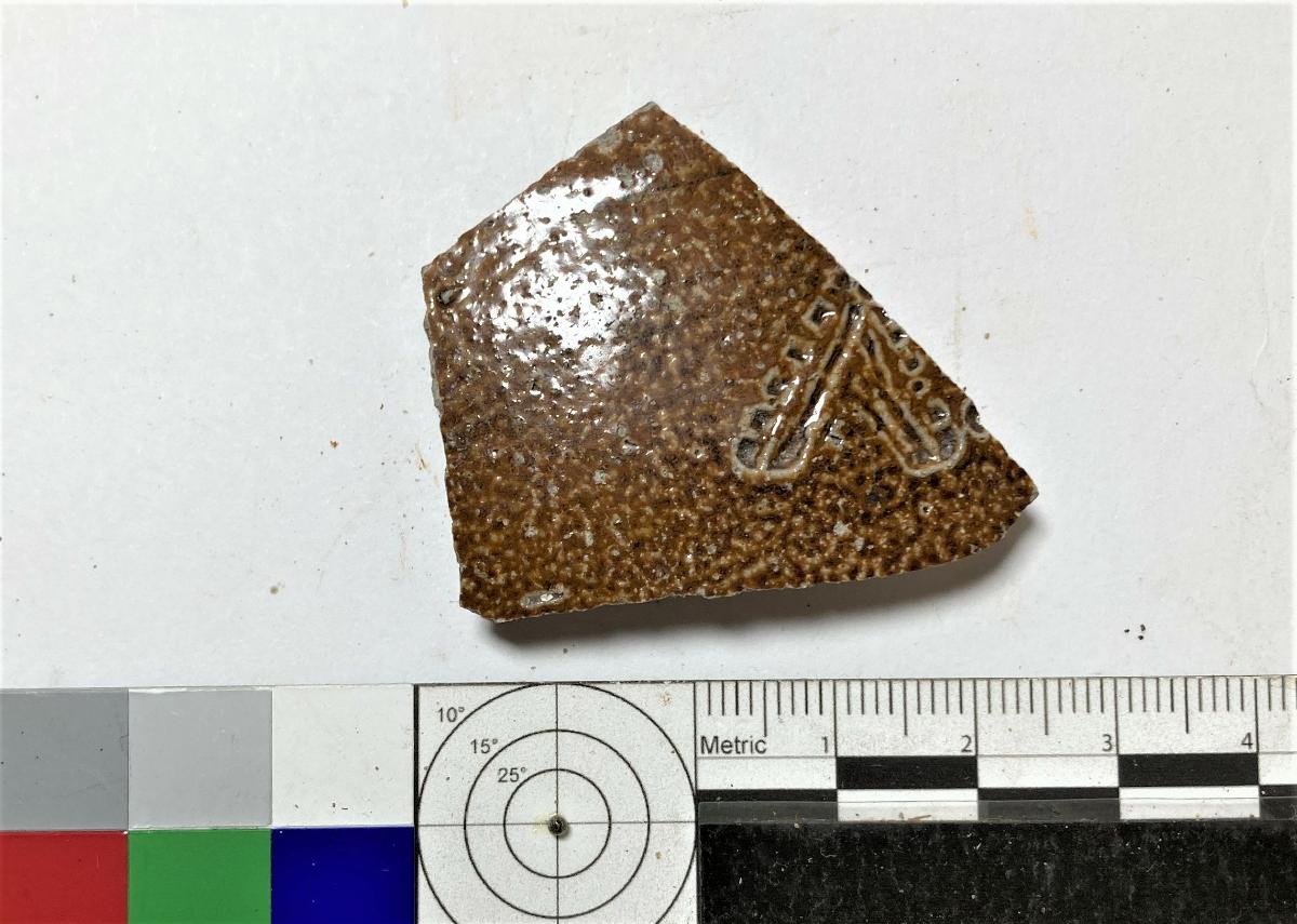 Skärva av kärl, lätt välvd, grått gods, beige insida, brunspräcklig utsida.