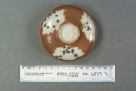 2) "handtaget" d: 34 mm. Ljusare brun, emaljfärgsresterna grå.