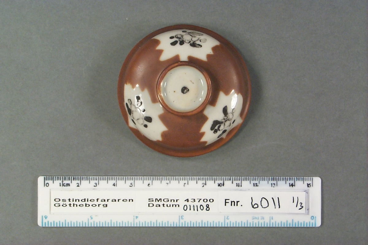 1) H: 25 mm, D: 75 mm.. Endast två besparingar i den bruna glasyren.