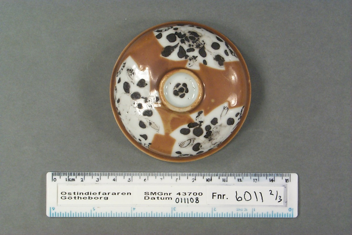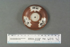 Lock till burk. Välvt med skålformat "handtag" i mitten på ovansidan, oglaserad kant, på undersidan, för passning i burken. Kategori D; brun glasyr med tre ursparningar och som dekorerats med emaljfärger. Emaljfärgerna är lösa och känsliga och har mestadels fallit av, de som är kvar är svarta i färgen.