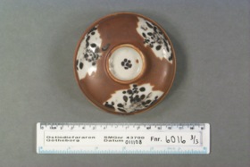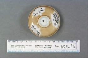 Lock till burk. Välvt med skålformat "handtag" i mitten på ovansidan, oglaserad kant, på undersidan, för passning i burken. Kategori D; brun glasyr med tre ursparningar i form av löv, som dekorerats med emaljfärger. Emaljfärgerna är lösa och känsliga och har mestadels fallit av, de som är kvar är svarta i färgen.