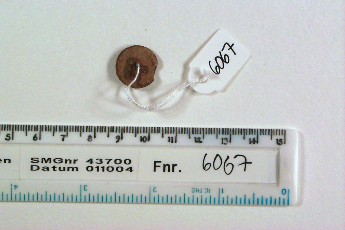 Knappform; cirkulär, lätt kullrig på ena sidan, flat på andra sidan, genomgående hål i mitten. Kraftigt nedbruten och eroderad, rester av järnkorrosion på hela ytan.