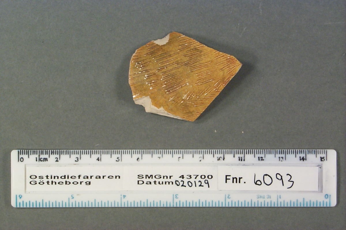 Föremålet är från vraket av ostindiefararen Götheborg, som gjorde tre resor till Kina 1739-45. Vid hemkomsten från den sista resan 12 september 1745 förliste fartyget vid grundet Hunnebådan strax utanför Nya Elfsborgs fästning. Vid flera tillfällen har material tagits upp från vraket. Föremålet kommer från de marinarkeologiska utgrävningarna på platsen 1986-1992.