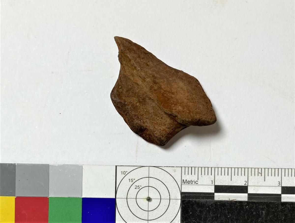 Skärva av kärl, fot till gryta. Kraftigt Missfärgad av järn. Eroderad