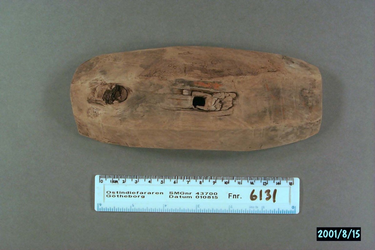 Föremålet är från vraket av ostindiefararen Götheborg, som gjorde tre resor till Kina 1739-45. Vid hemkomsten från den sista resan 12 september 1745 förliste fartyget vid grundet Hunnebådan strax utanför Nya Elfsborgs fästning. Vid flera tillfällen har material tagits upp från vraket. Föremålet kommer från de marinarkeologiska utgrävningarna på platsen 1986-1992.