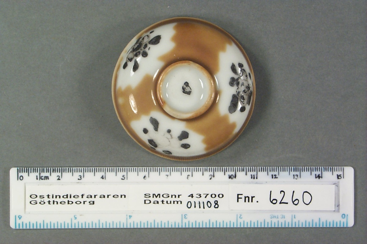 Lock till burk. Välvt med skålformat "handtag" i mitten på ovansidan, oglaserad kant, på undersidan, för passning i burken. Kategori D; brun glasyr med tre ursparningar i form av löv, som dekorerats med emaljfärger. Emaljfärgerna är lösa och känsliga och har mestadels fallit av, de som är kvar är svarta i färgen.