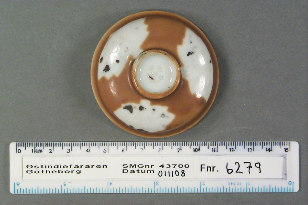 Lock till burk. Välvt med skålformat "handtag" i mitten på ovansidan, oglaserad kant, på undersidan, för passning i burken. Kategori D; brun glasyr med tre ursparningar i form av löv, som dekorerats med emaljfärger. Emaljfärgerna är lösa och känsliga och har mestadels fallit av, de som är kvar är svarta i färgen.