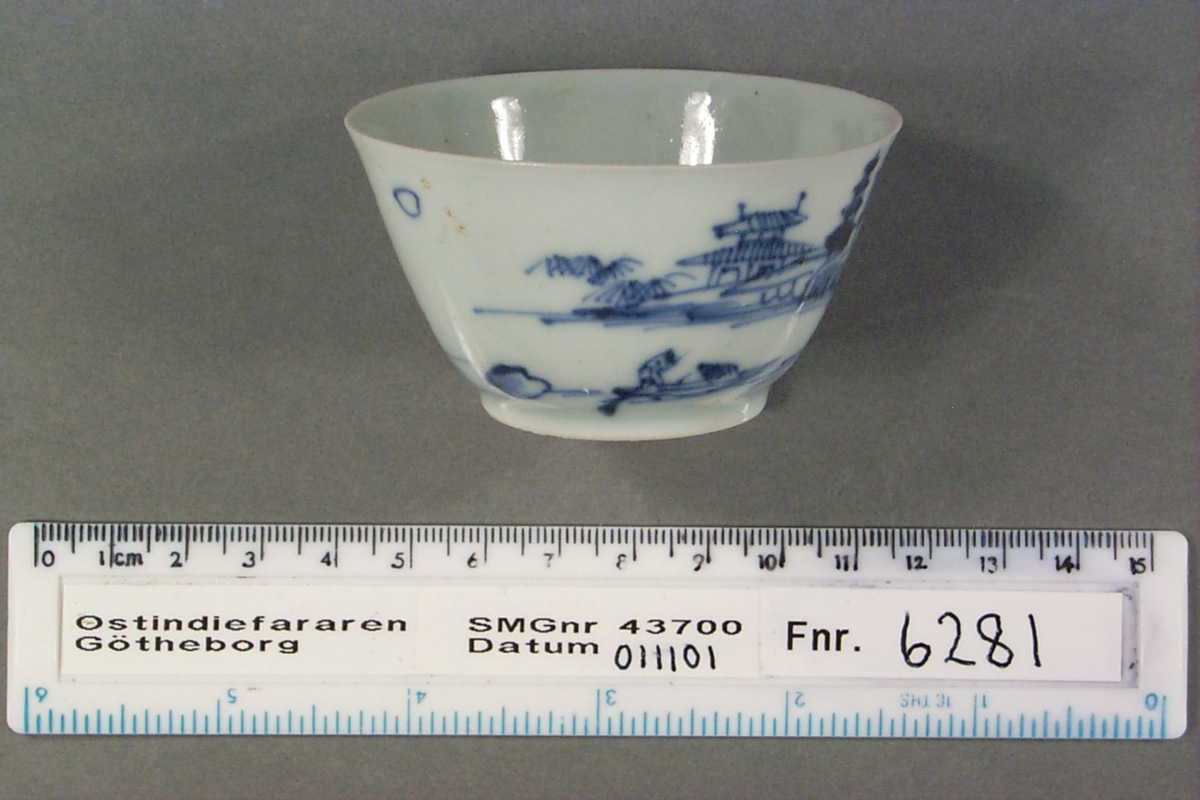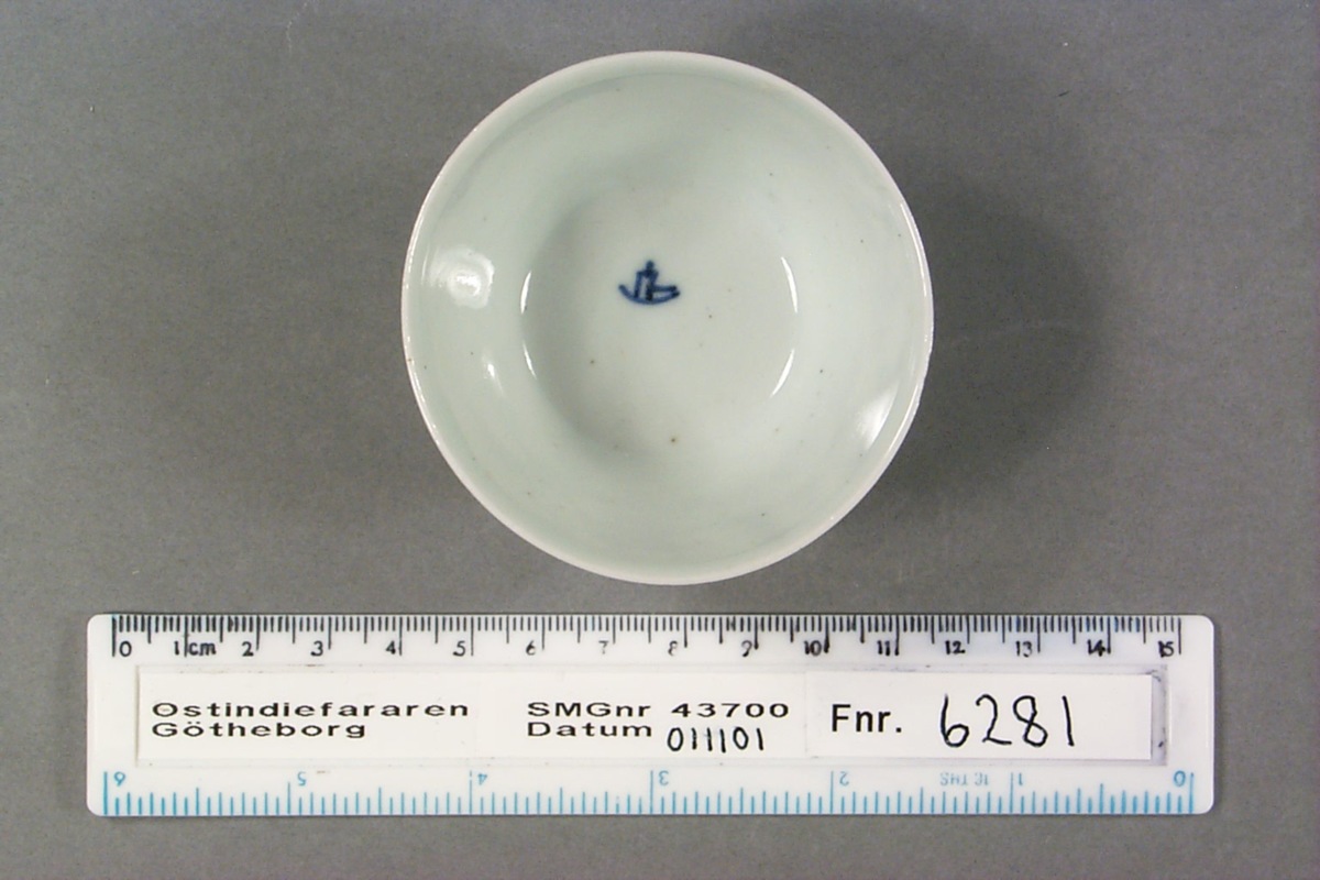 Kategori A; underglasyrblå dekor. Mycket tunt och fint gods. Ett litet kantavslag i mynningskanten. Små bruna fläckar på utsidan.