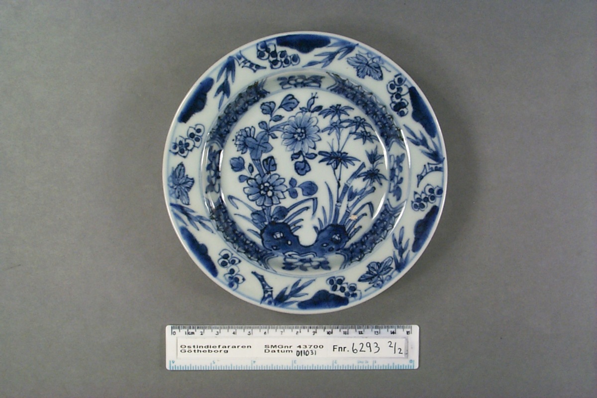 Underglasyrblå dekor i form av bambu och andra växter och bär. Även målade blad på undersidan av brättet.