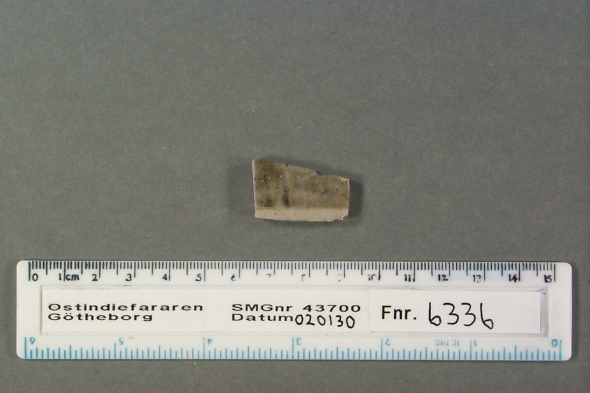 Föremålet är från vraket av ostindiefararen Götheborg, som gjorde tre resor till Kina 1739-45. Vid hemkomsten från den sista resan 12 september 1745 förliste fartyget vid grundet Hunnebådan strax utanför Nya Elfsborgs fästning. Vid flera tillfällen har material tagits upp från vraket. Föremålet kommer från de marinarkeologiska utgrävningarna på platsen 1986-1992.