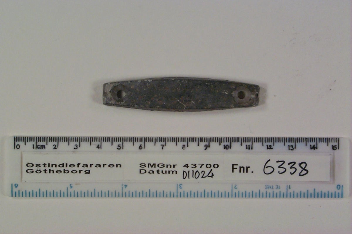Blysänke? Zinkanod? Rektangulärt med välvd översida, två genomgående hål d: 3 mm, med försänkning d: 8 mm.