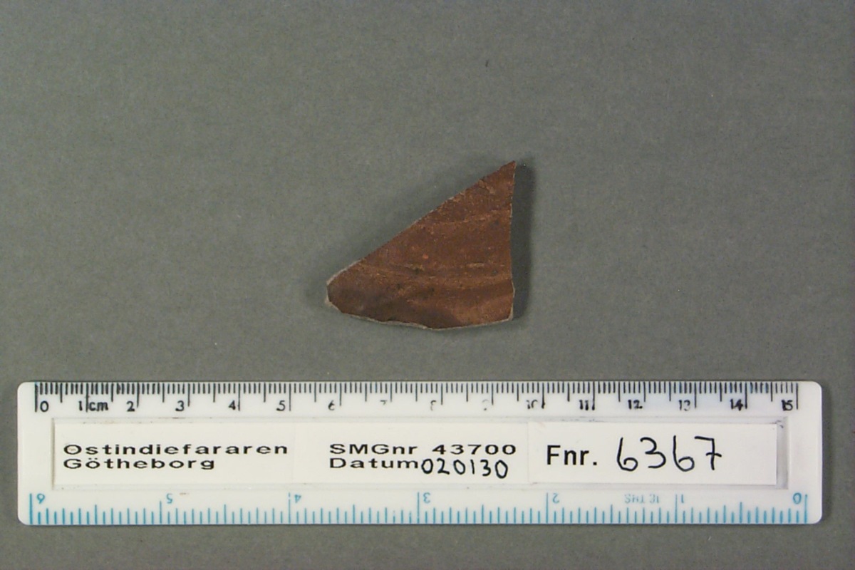 Föremålet är från vraket av ostindiefararen Götheborg, som gjorde tre resor till Kina 1739-45. Vid hemkomsten från den sista resan 12 september 1745 förliste fartyget vid grundet Hunnebådan strax utanför Nya Elfsborgs fästning. Vid flera tillfällen har material tagits upp från vraket. Föremålet kommer från de marinarkeologiska utgrävningarna på platsen 1986-1992.