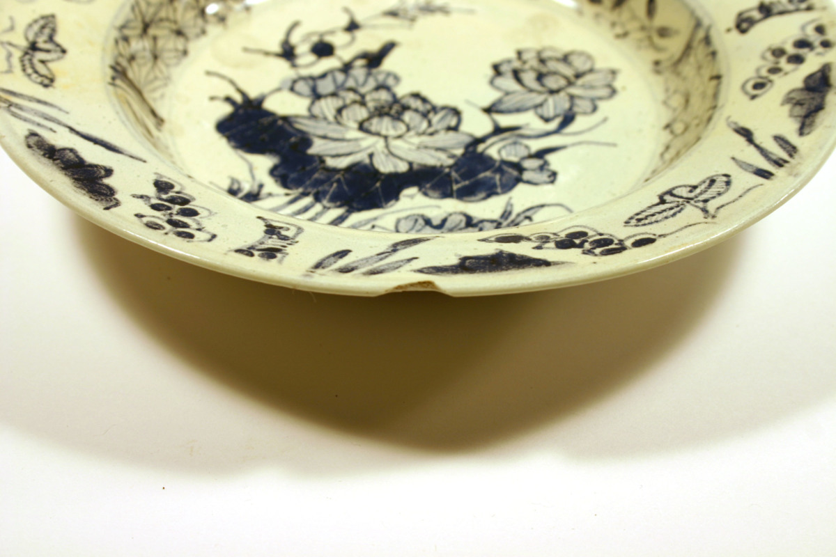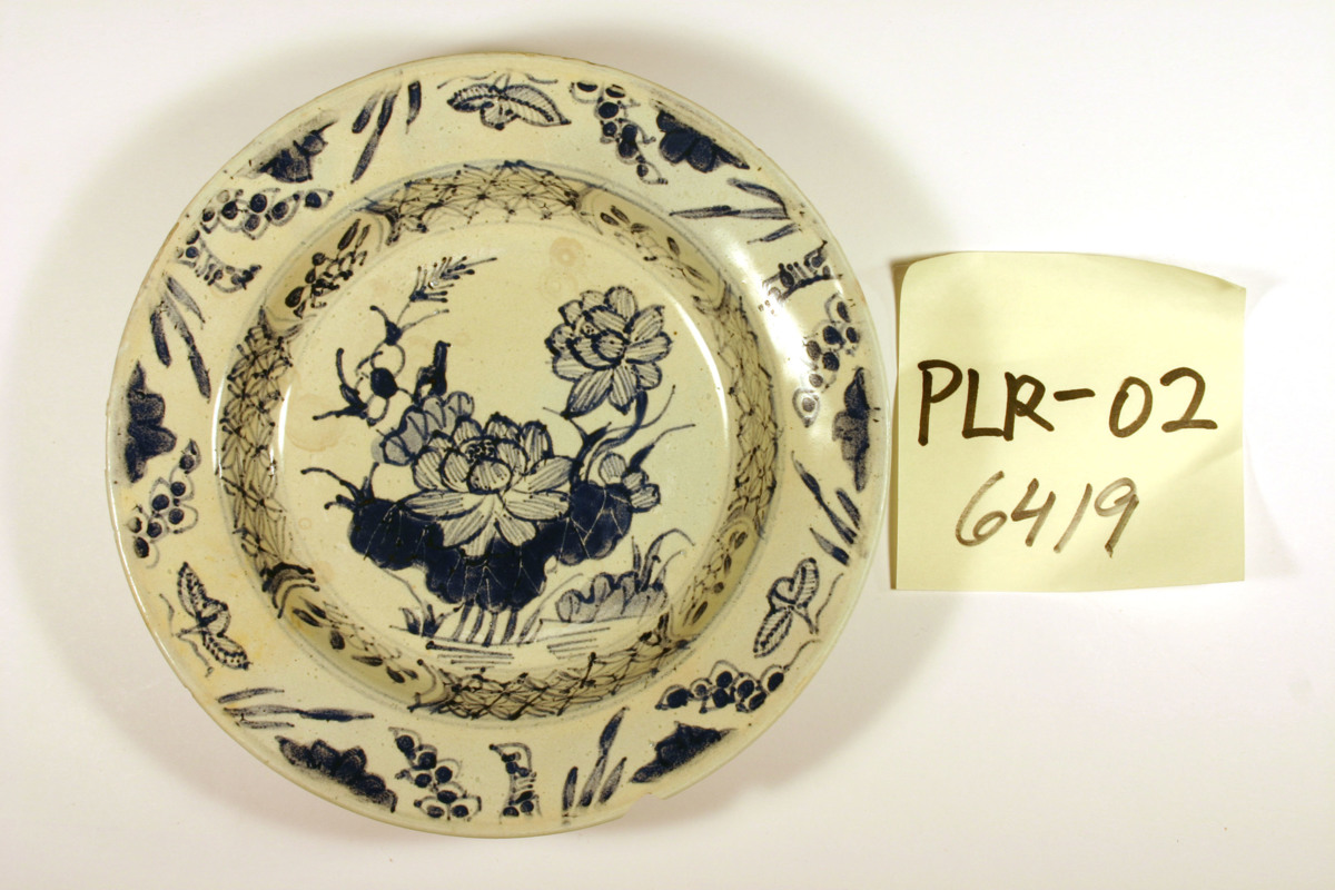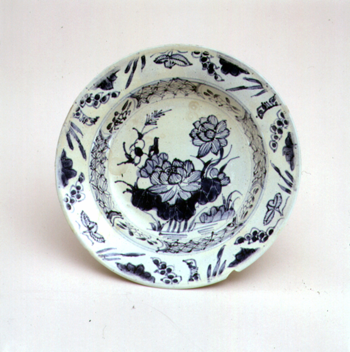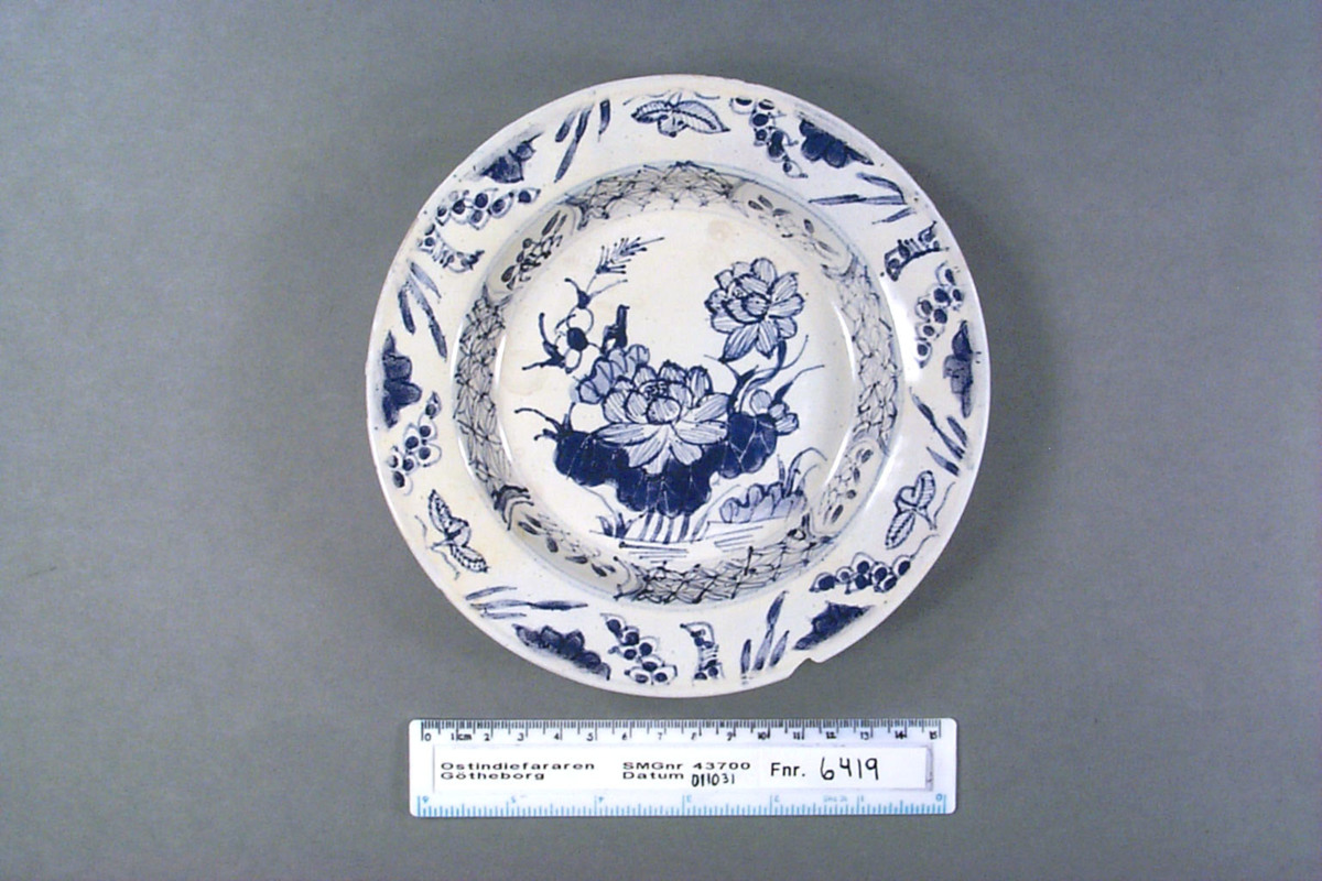 Kategori A; Underglasyrblå dekor; motiv: Mittmotivet lotusblommor, i kälningen en stjärnbård med blomreserver och runt brättet vindruvor och bambu. Kvistrankor på brättets baksida.
