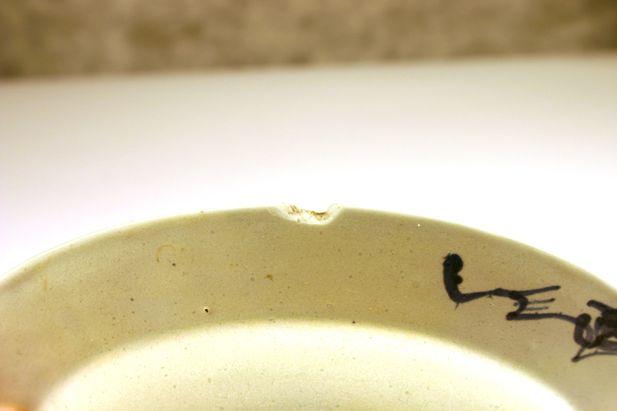 Blek suddig dekor. Något matt yta. Avslagna flisor i mynningskanten. Gul missfärgning över halva ytan.