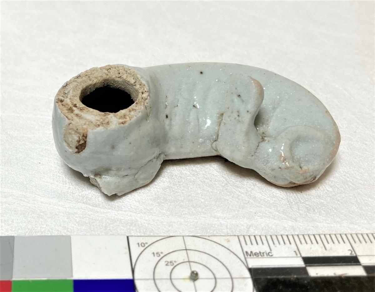 Hundar, gråvit glasyr på ovansidan, oglaserad på undersidan, liggande med höger ben under kroppen, skarabé i ett band runt halsen. Framtassarna och huvudet avbrutna.
