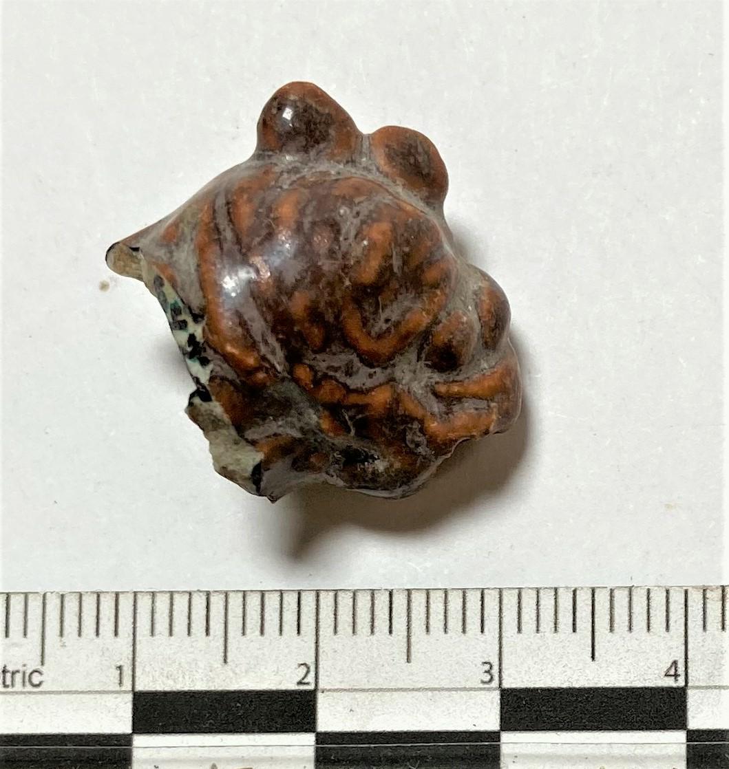 1) Huvud av hund eller annat djur, brun glasyr på utsidan, hål i munnen d: 3,5 mm, för rökelse?