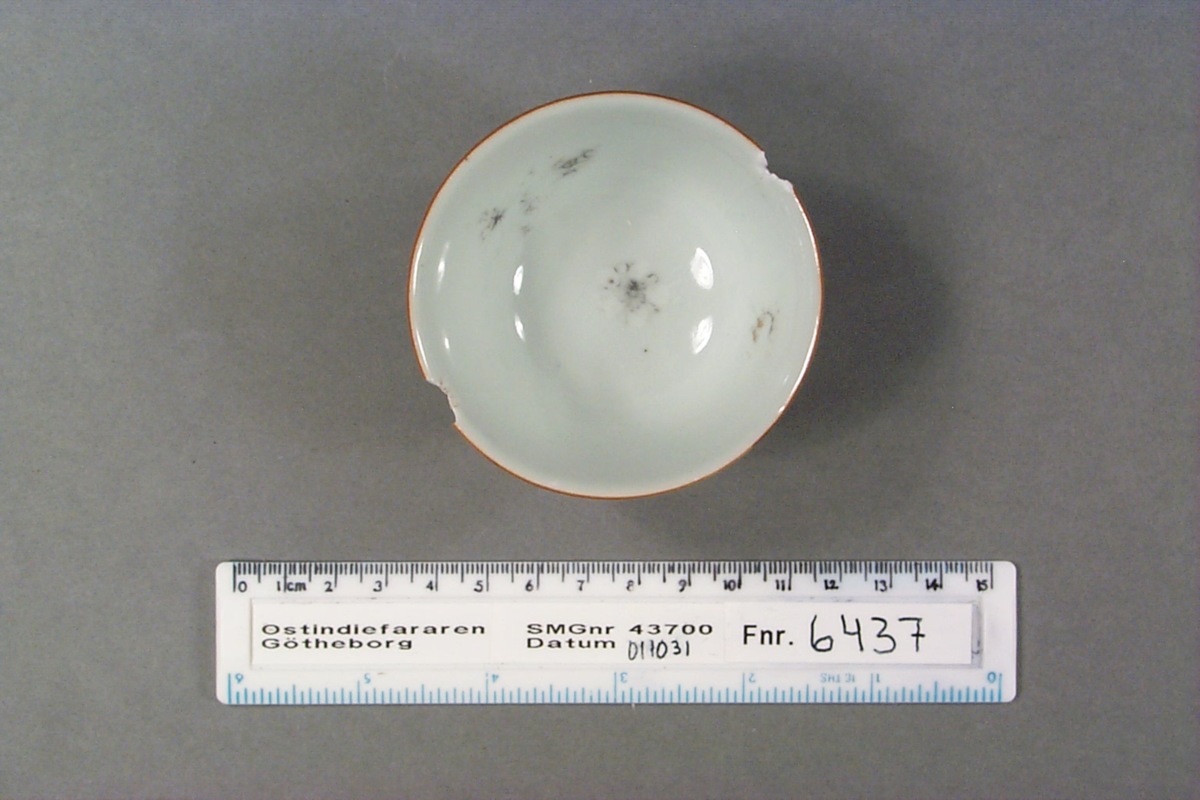 Kategori D; Brun glasyr på utsidan och emaljfärgsdekor på insidan. Bortfallen emaljfärgsdekor, två kantavslag i mynningskanten.