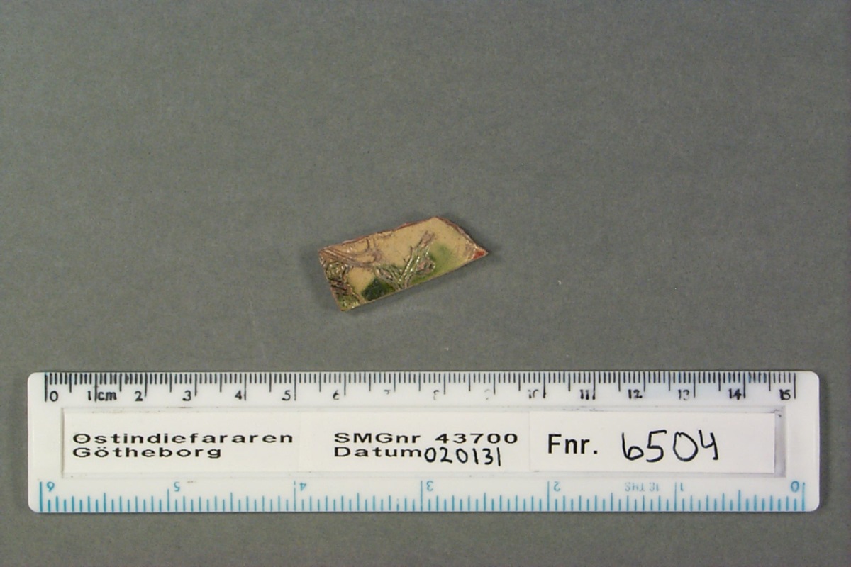 Skärva, flat, ljust gods med ristat mönster, färgat i grönt, rött och gult. Glaserad.