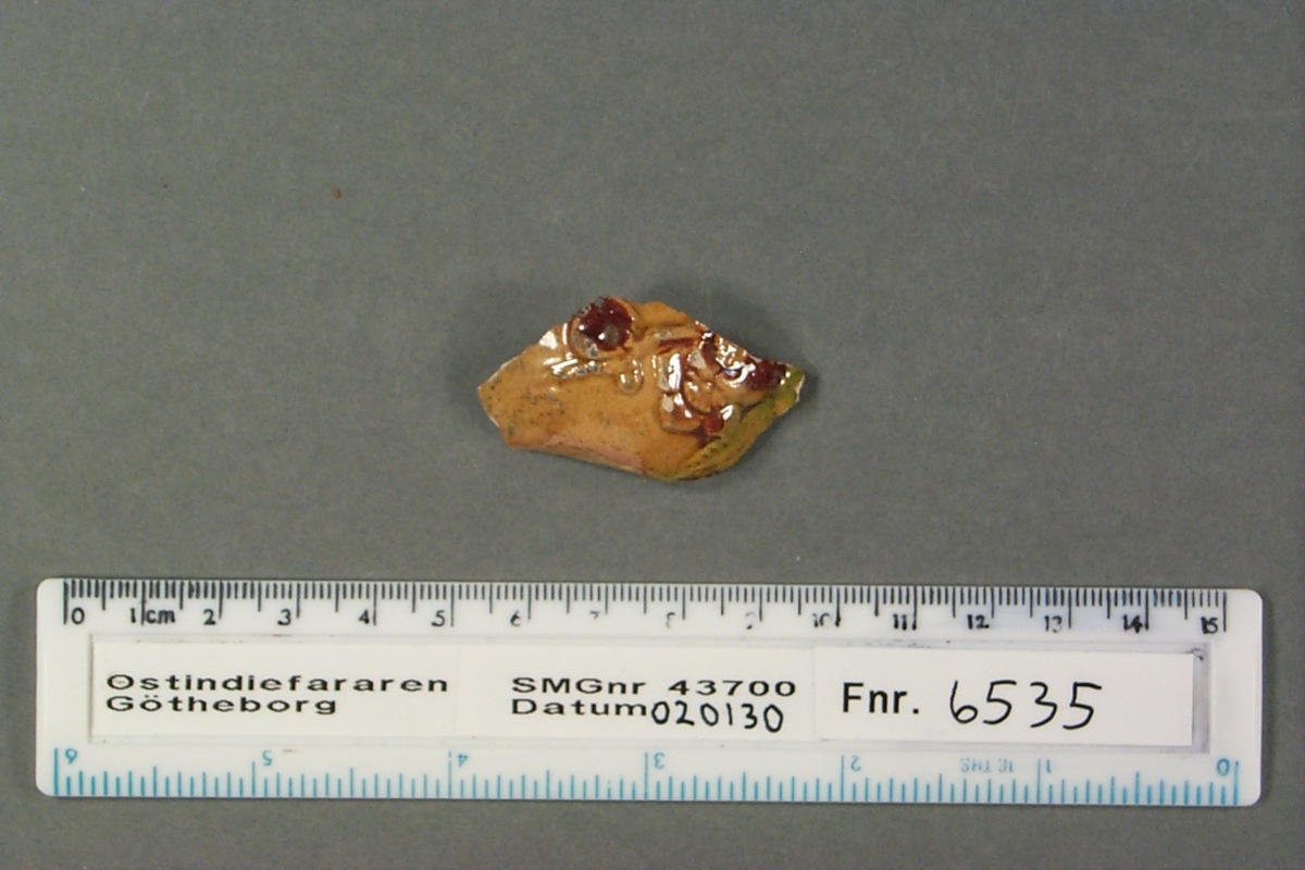 Skärva av persika, välvd, tryckt i form, glaserad i gult, rött och grönt.