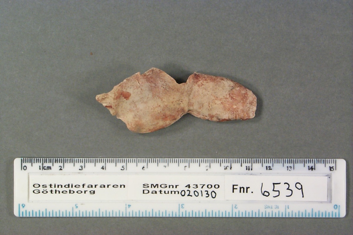 Föremålet är från vraket av ostindiefararen Götheborg, som gjorde tre resor till Kina 1739-45. Vid hemkomsten från den sista resan 12 september 1745 förliste fartyget vid grundet Hunnebådan strax utanför Nya Elfsborgs fästning. Vid flera tillfällen har material tagits upp från vraket. Föremålet kommer från de marinarkeologiska utgrävningarna på platsen 1986-1992.