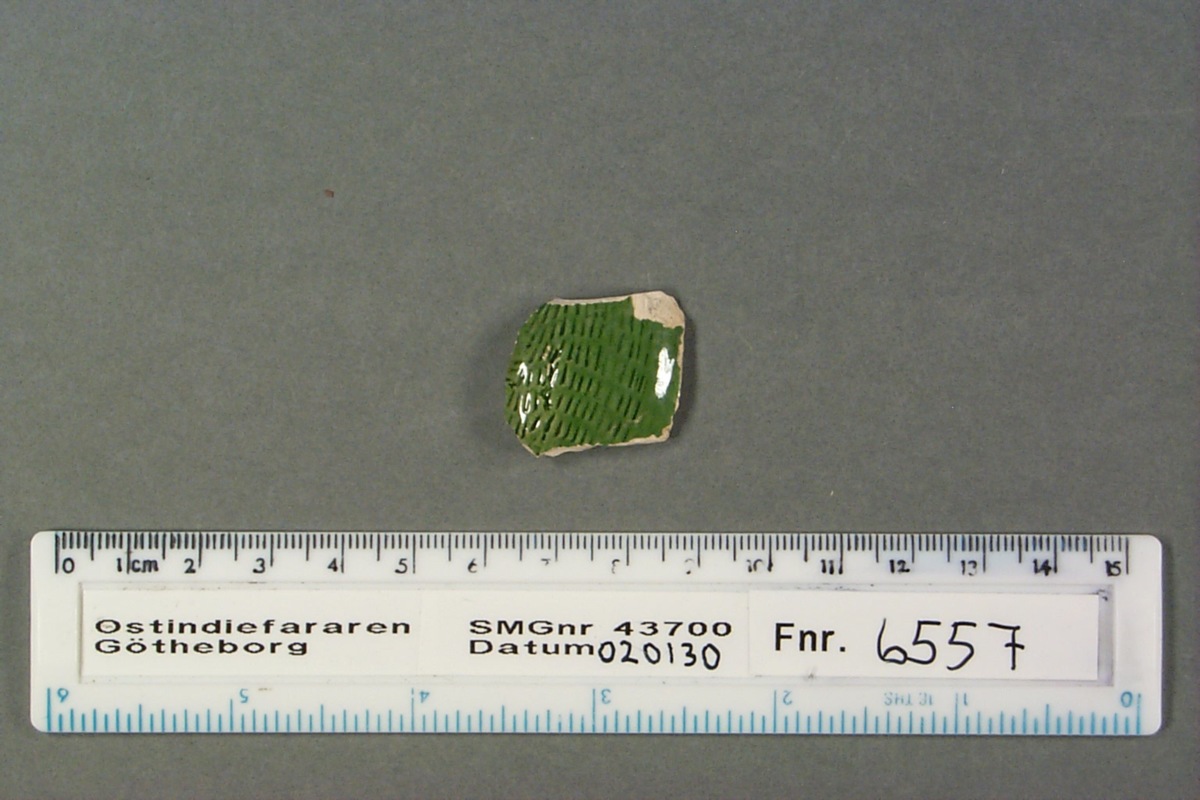 Föremålet är från vraket av ostindiefararen Götheborg, som gjorde tre resor till Kina 1739-45. Vid hemkomsten från den sista resan 12 september 1745 förliste fartyget vid grundet Hunnebådan strax utanför Nya Elfsborgs fästning. Vid flera tillfällen har material tagits upp från vraket. Föremålet kommer från de marinarkeologiska utgrävningarna på platsen 1986-1992.