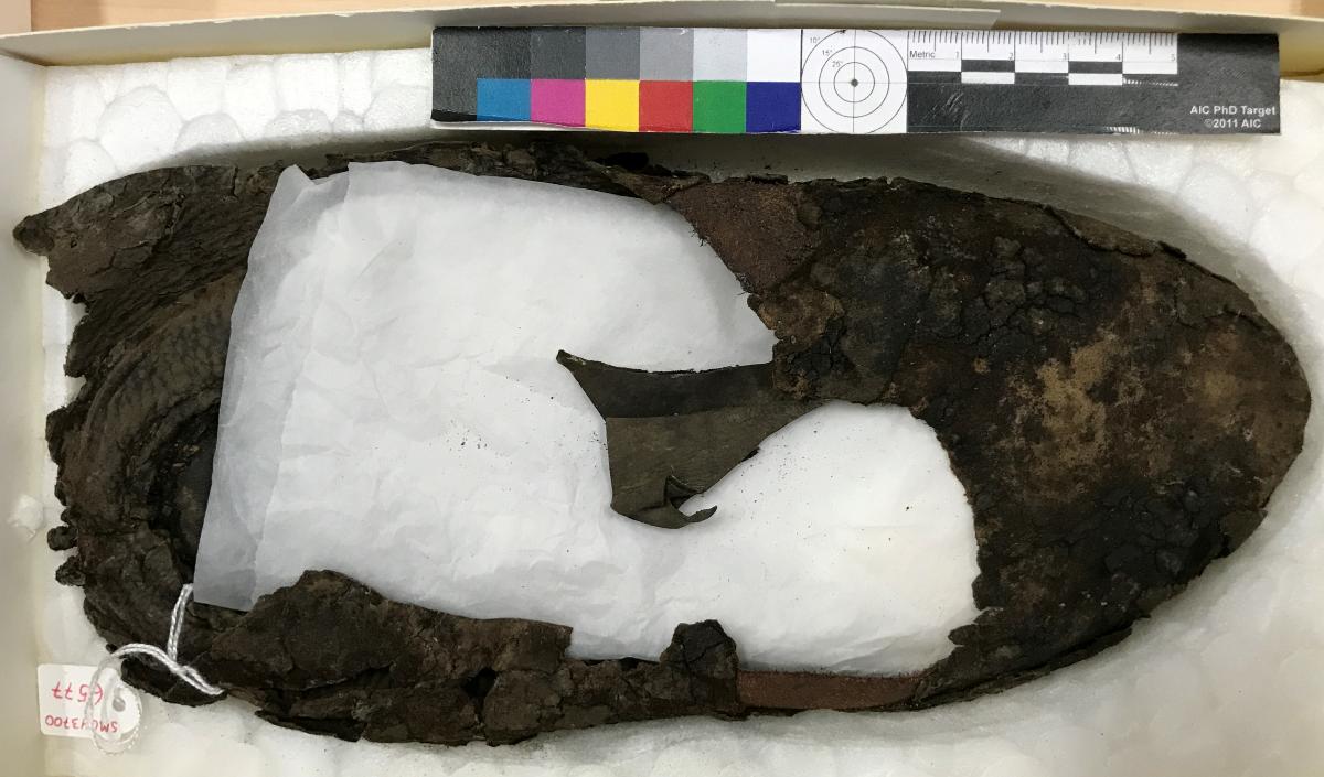 Högersko, del av. Sulans mått: l: 235 mm, b: 88 mm. Klacken är pliggad med 15 större och 38 mindre pliggar. Sulan är pliggad med ett stort antal mindre pliggar och sydd. Bes och ovanläder är sydda till sulan. Vid konserveringen har delarna monterats, ingen uppgift om vilket bindemedel som använts.