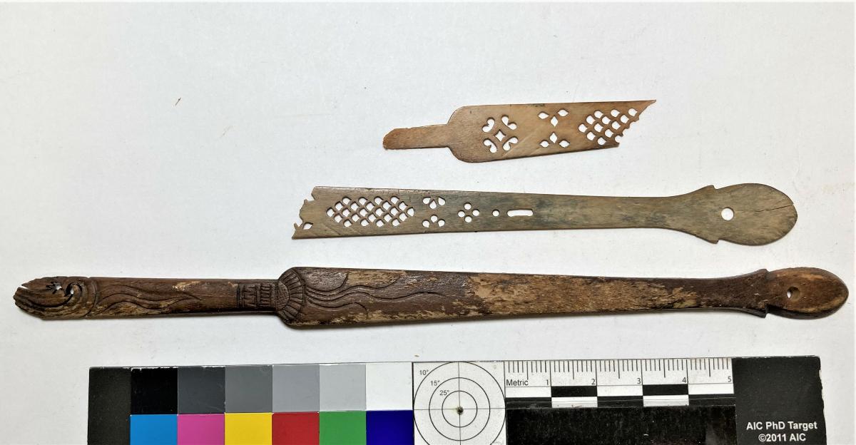 2) L: 140 mm, b: 14 mm, t: 0,65 mm. Spröt, del av. Bas med genomgående hål för sammanfogning, dekoration i form av borrade/stansade hål; cirklar och blad. Spricka i basen.
