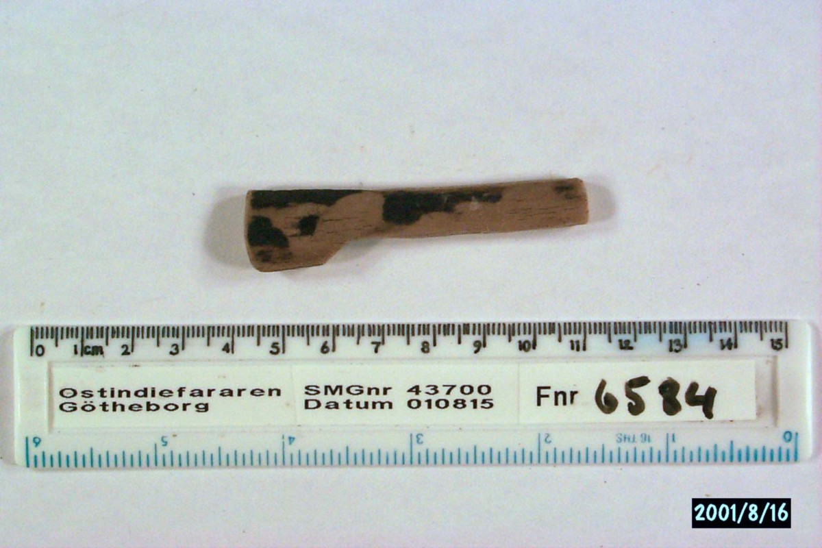 Föremålet är från vraket av ostindiefararen Götheborg, som gjorde tre resor till Kina 1739-45. Vid hemkomsten från den sista resan 12 september 1745 förliste fartyget vid grundet Hunnebådan strax utanför Nya Elfsborgs fästning. Vid flera tillfällen har material tagits upp från vraket. Föremålet kommer från de marinarkeologiska utgrävningarna på platsen 1986-1992.