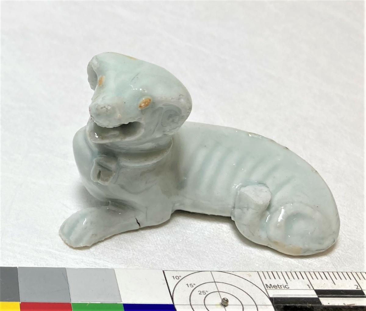 Hund i ljus turkosblå glasyr på ovansidan, oglaserad på undersidan, liggande med höger ben under kroppen, skarabé i ett band runt halsen.