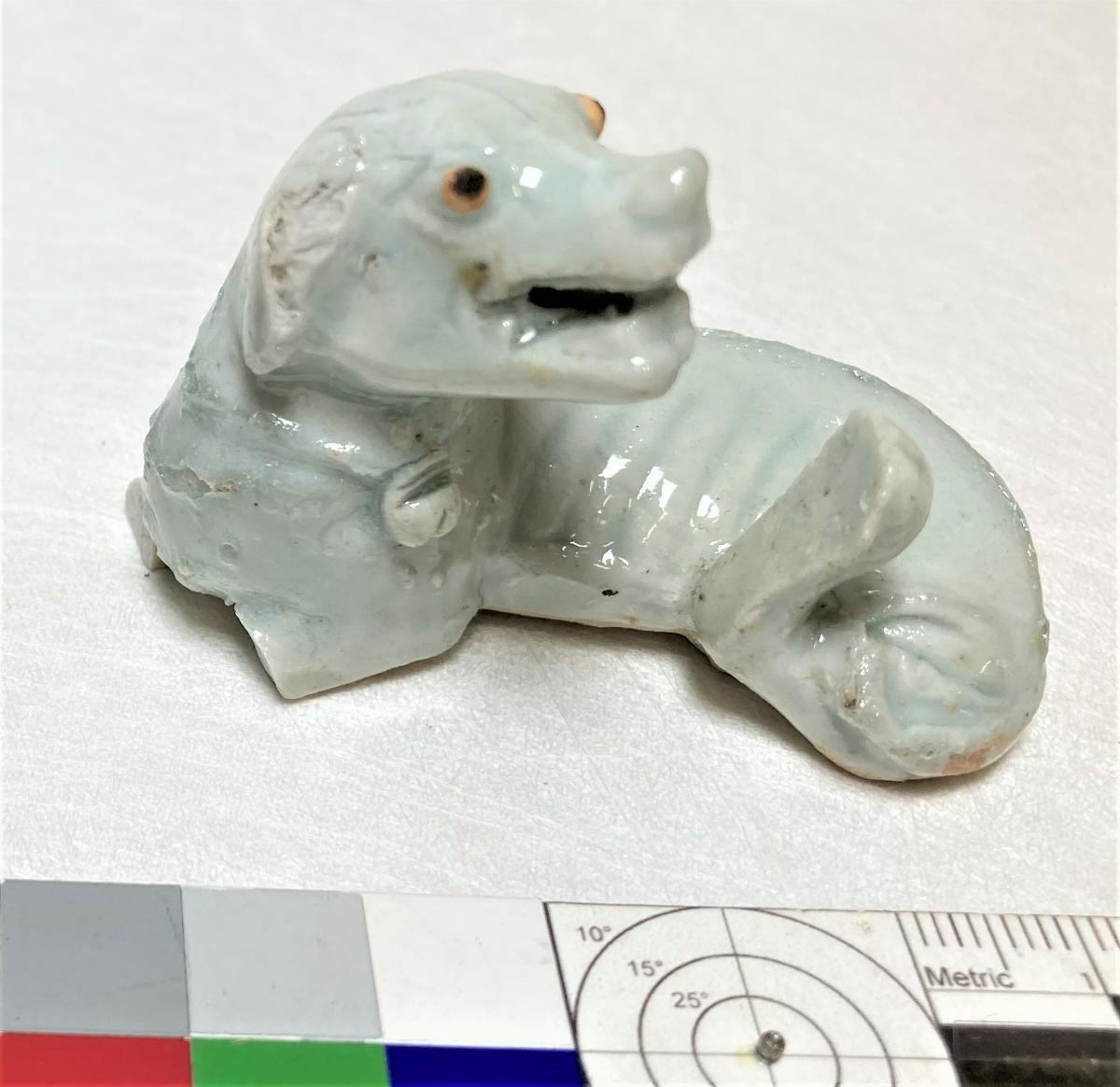 Hund i ljus turkosblå glasyr på ovansidan, oglaserad på undersidan, liggande med höger ben under kroppen, skarabé i ett band runt halsen.