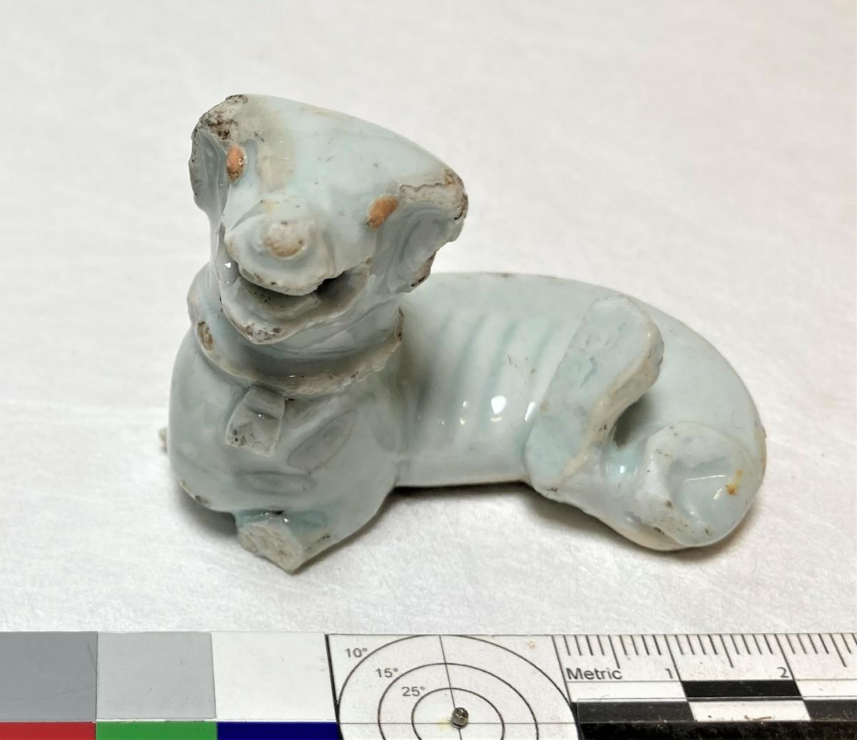 Hund i ljus turkosblå glasyr på ovansidan, oglaserad på undersidan, liggande med höger ben under kroppen, skarabé i ett band runt halsen.