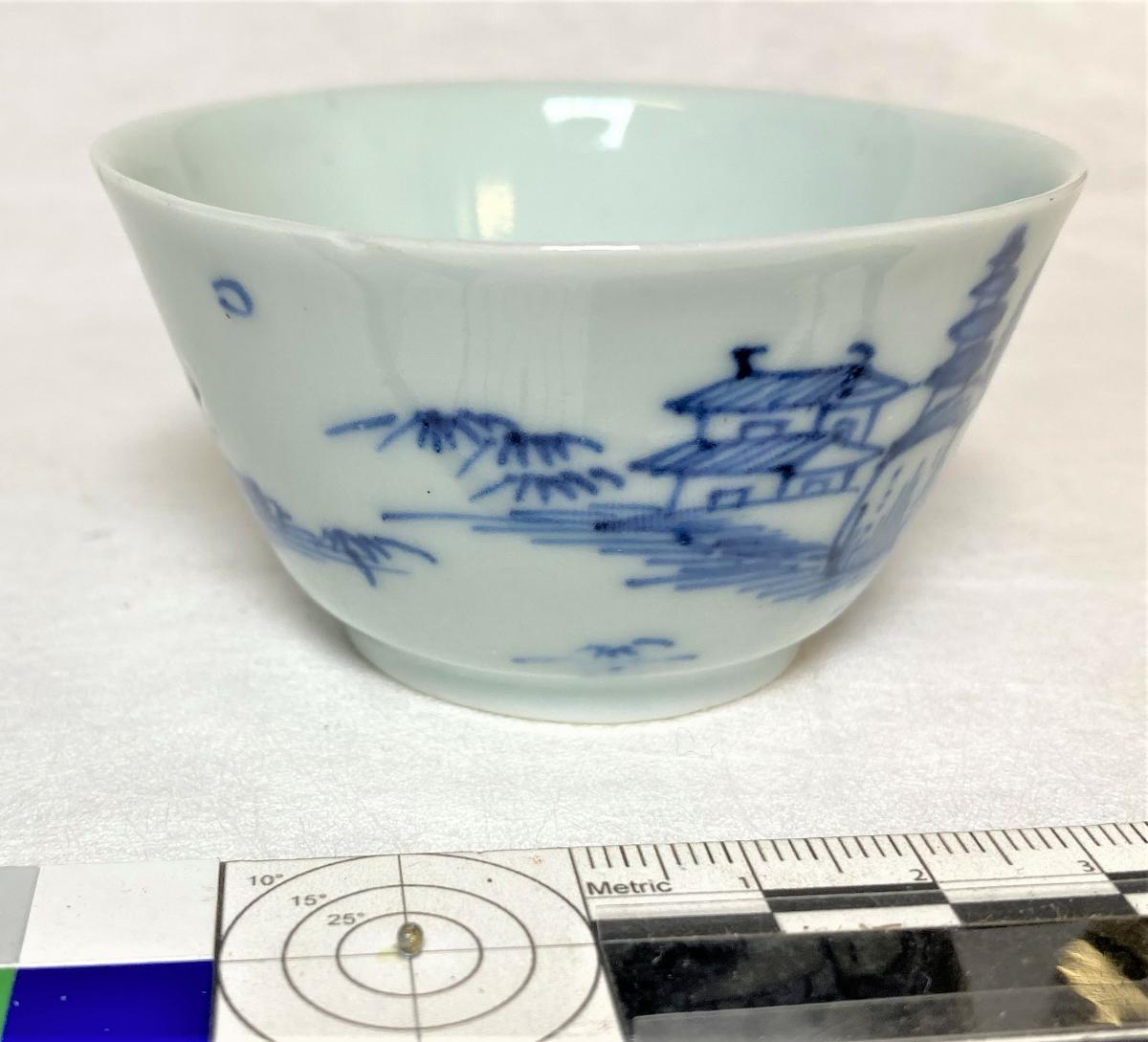 Liten kopp, dekorkategori A; underglasyrblå dekor. På utsidan motiv träd, hus och fiskande människor, på insidan en ensam liten symbol.