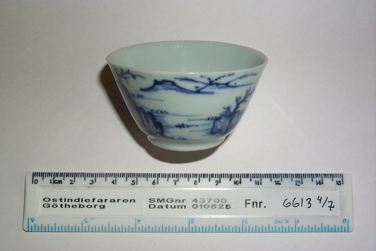 Liten kopp, dekorkategori A; underglasyrblå dekor. På utsidan motiv träd, hus och fiskande människor, på insidan en ensam liten symbol.
