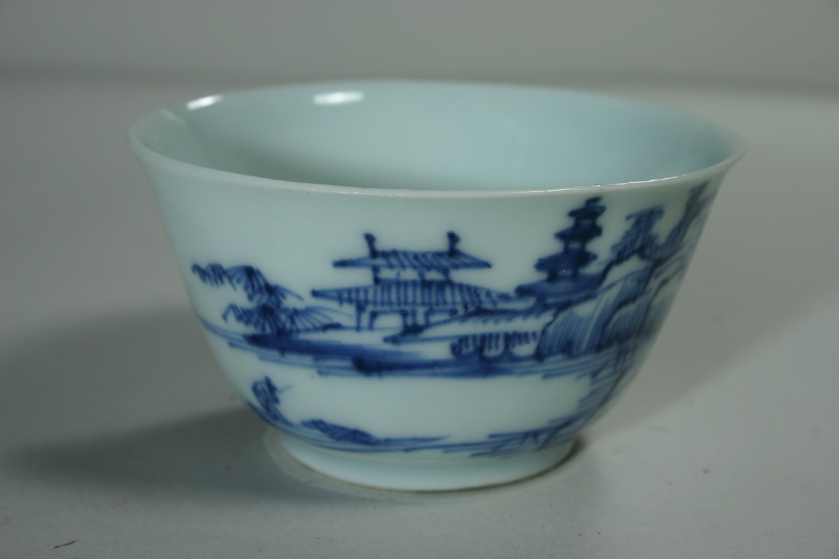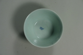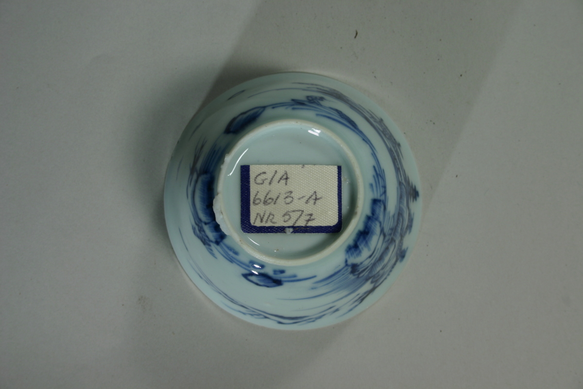 Liten kopp, dekorkategori A; underglasyrblå dekor. På utsidan motiv träd, hus och fiskande människor, på insidan en ensam liten symbol.