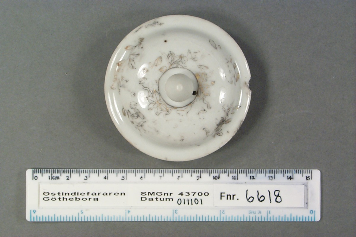 Lock, till tekanna el, burk. Med droppformig något matt knopp. Genomgående hål invid knoppen, d: 2 mm. Rester av emaljfärgsdekor; guld och svart. Ett kantavslag på lockets brätte.