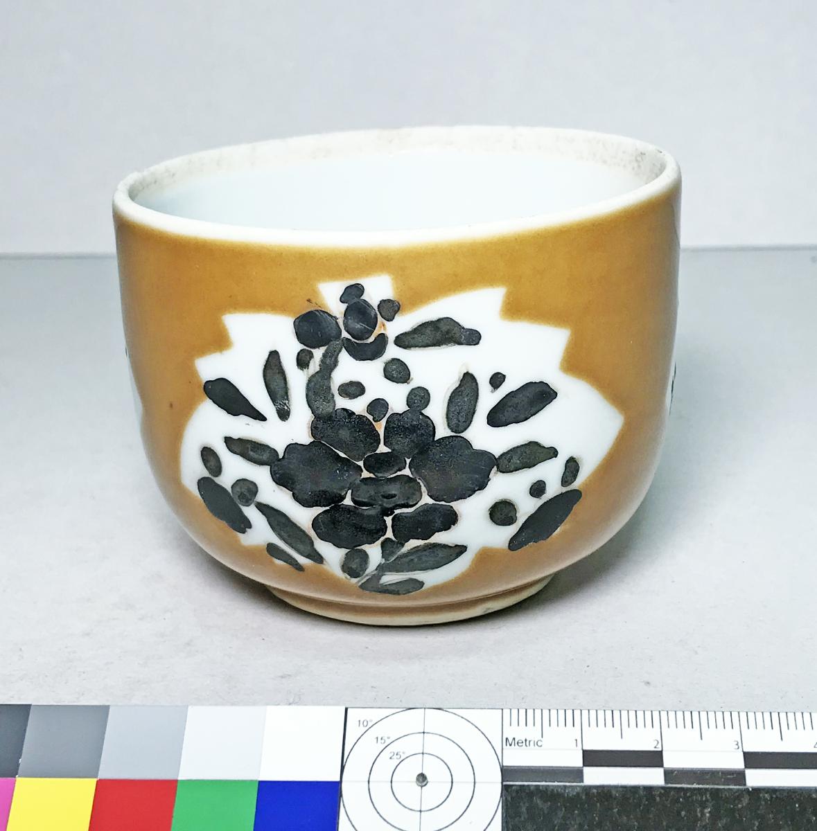 Cylindrisk burk. Kategori D; brun glasyr med tre ursparningar i form av löv, som dekorerats med emaljfärger. Emaljfärgerna är lösa och känsliga och har mestadels fallit av, de som är kvar är svarta i färgen. Oglaserad vid mynningskanten på insidan.