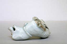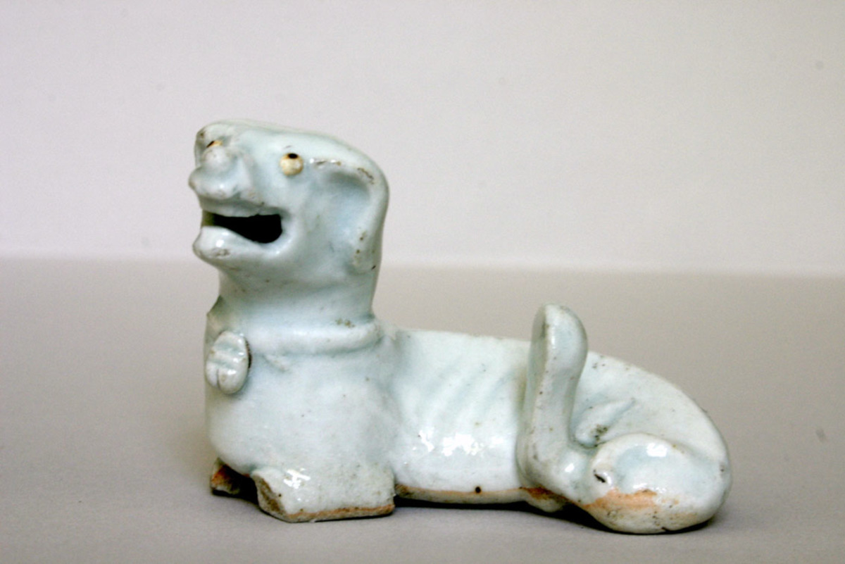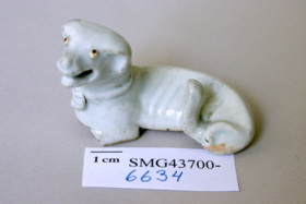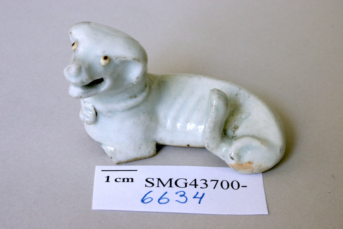 Hundar i ljus turkosblå glasyr på ovansidan, oglaserad på undersidan, liggande med höger ben under kroppen, skarabé i ett band runt halsen. Framtassarna avbrutna.