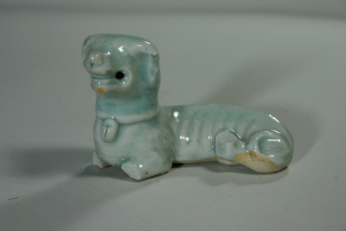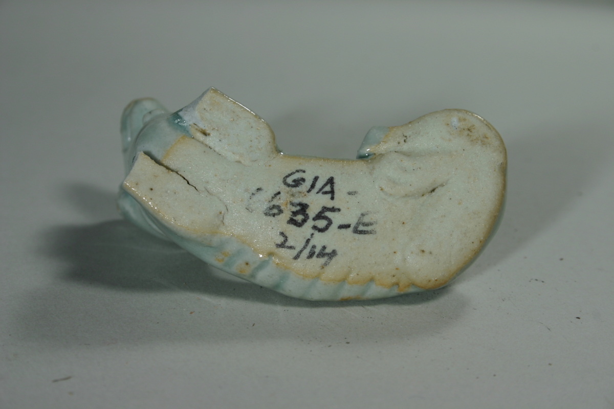Liggande hund i ljus turkosblå glasyr på ovansidan, oglaserad på undersidan, liggande med höger bakben under kroppen, skarabé i ett band runt halsen. Båda frambenen och vänster bakben avbrutna.