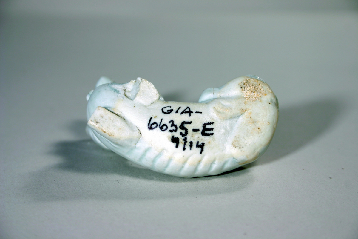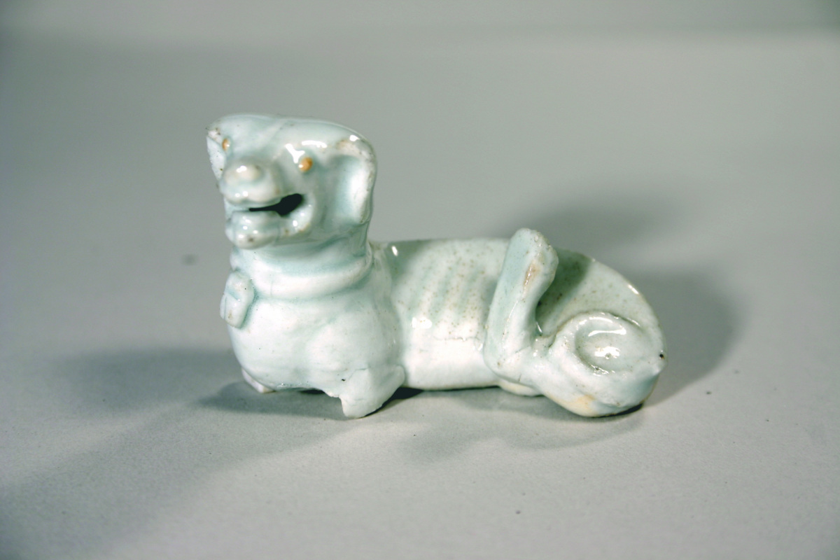 Hund i ljus turkosblå glasyr på ovansidan, oglaserad på undersidan, liggande med höger bakben under kroppen, skarabé i ett band runt halsen.Båda frambenen avbrutna.