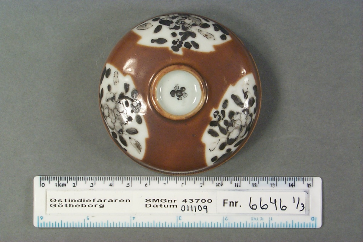 Lock till burk. Välvt med skålformat "handtag" i mitten på ovansidan, oglaserad kant, på undersidan, för passning i burken. Kategori D; brun glasyr med tre ursparningar i form av löv, som dekorerats med emaljfärger. Emaljfärgerna är lösa och känsliga och har mestadels fallit av, de som är kvar är svarta i färgen.