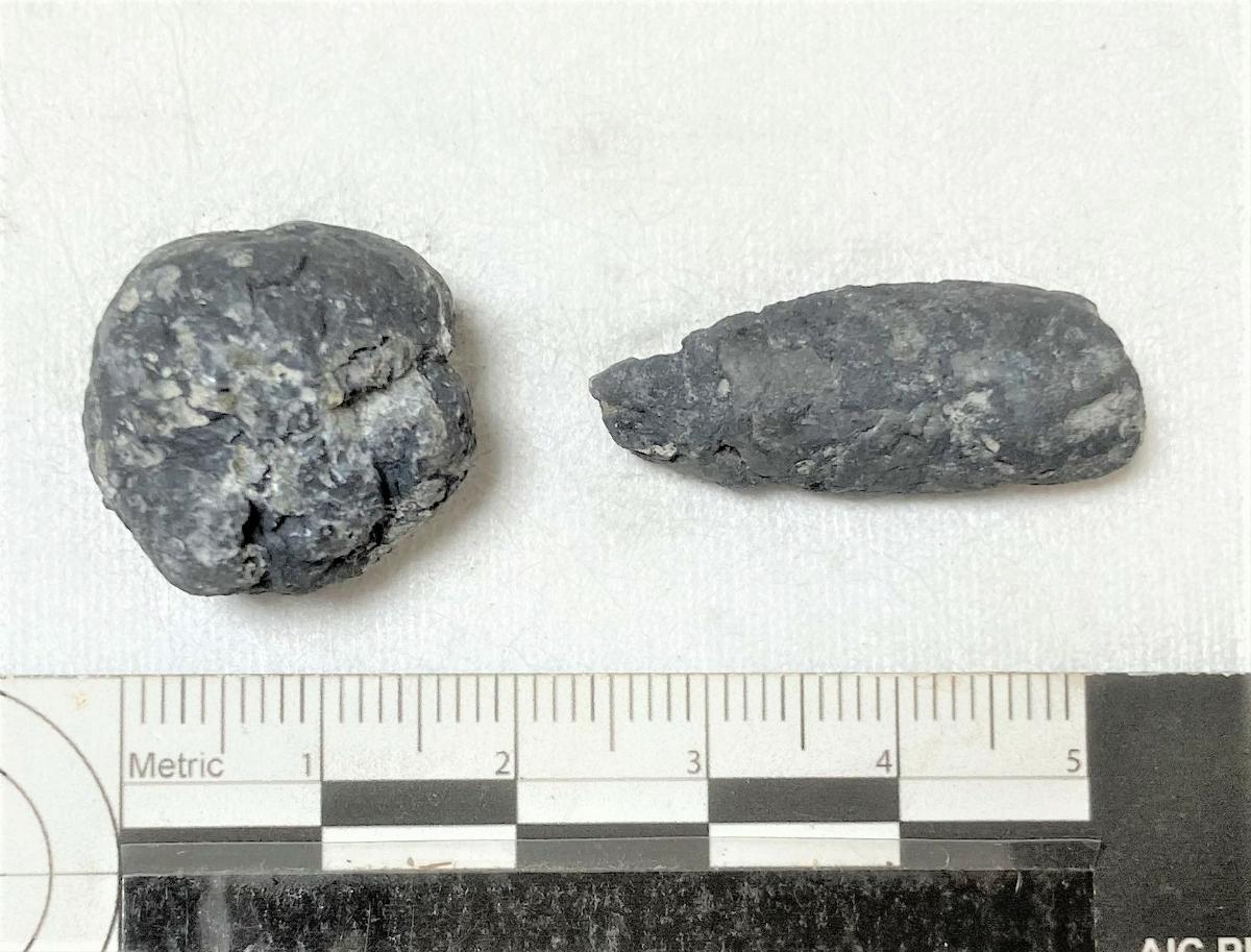 Två blyklumpar, olika former, den ena hopvikt bly, mått ovan, den andra knölig men i stort sett sfärisk, d ca 19 mm.