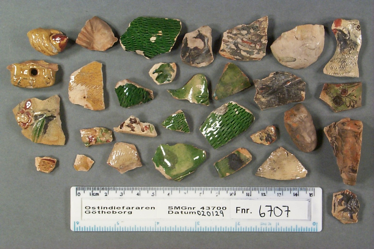 Skärvor, mestadels från figuriner. Glaserade i grönt, gult eller grått. Föreställande fåglar, lejon/apa m.m.